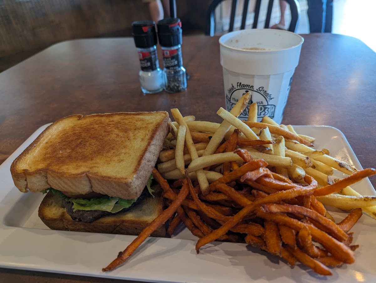 Custom Burger with 1 2 Plater of Fries & Sweet Potato Fries